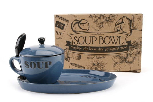 Natural Coloured Ceramic Soup Bowls With Spoon & Lid & Bread Plate Gift Box NEW