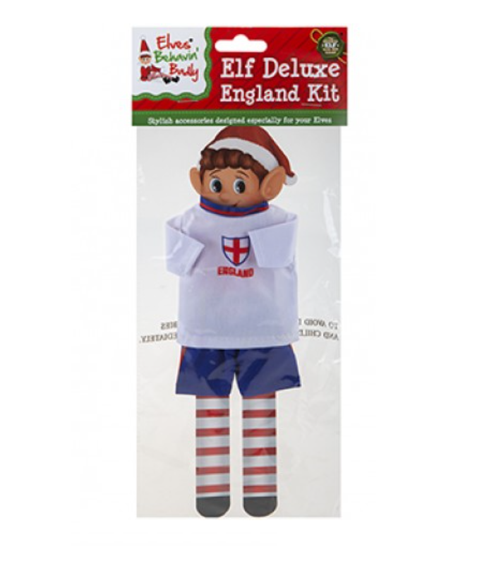 Deluxe England football dressing up kit for Elfie. He can create havoc and celebrate the greatest football team in style.